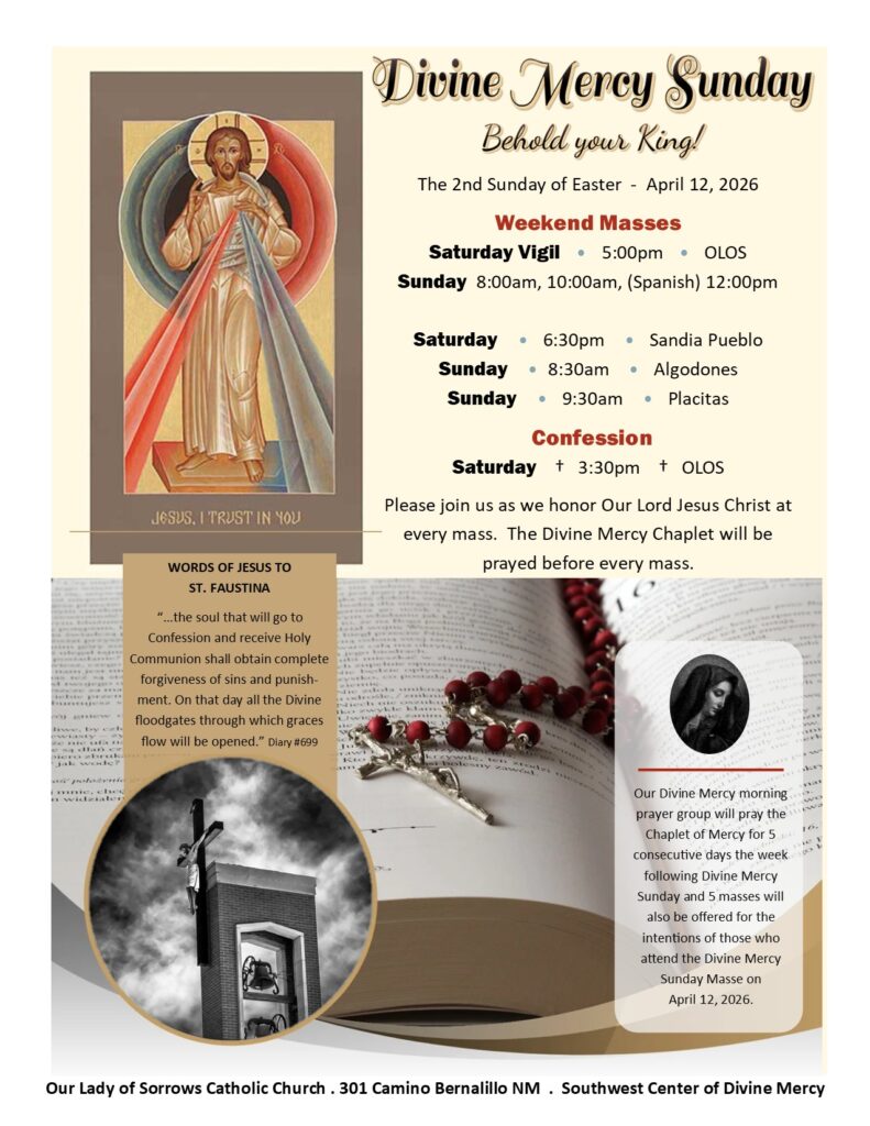 Sunday: 8 AM, 10 AM, 12 PM (Spanish)